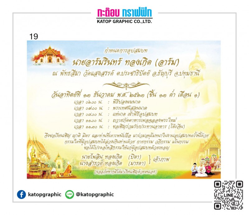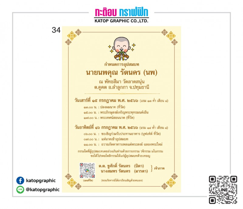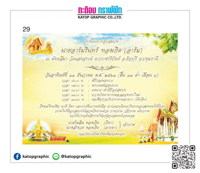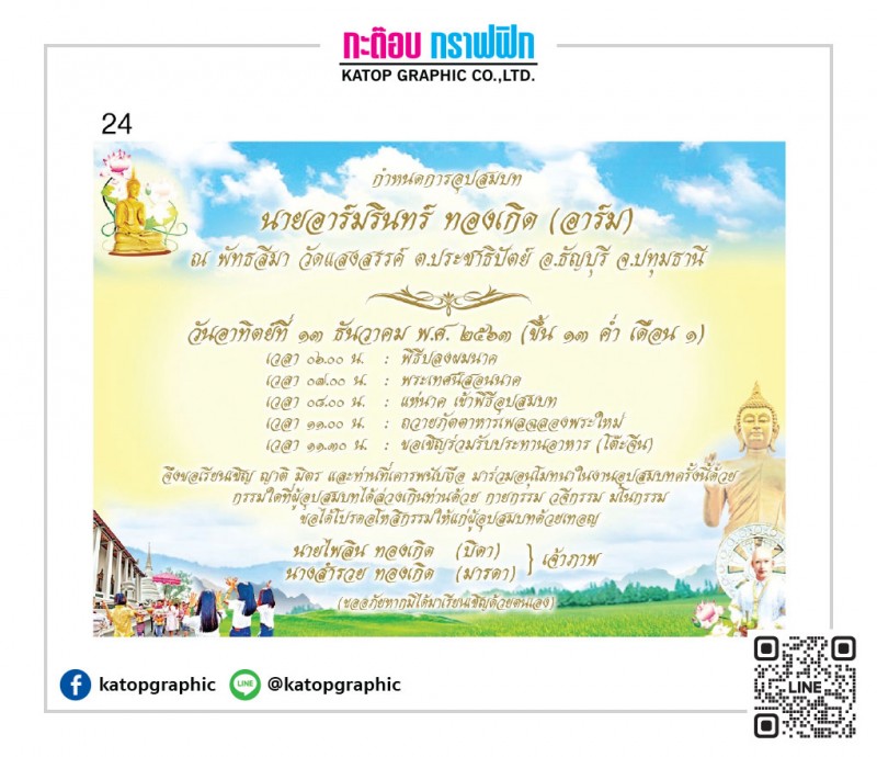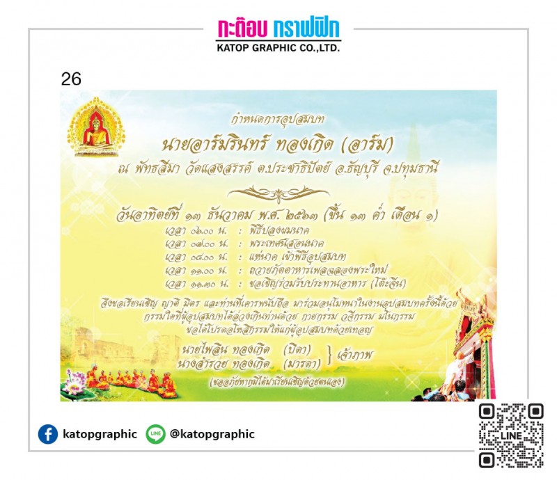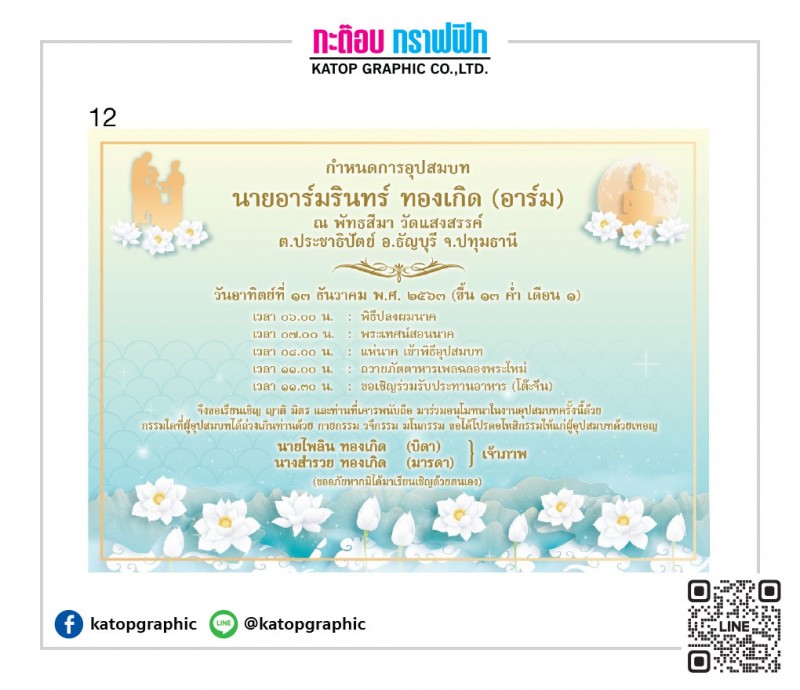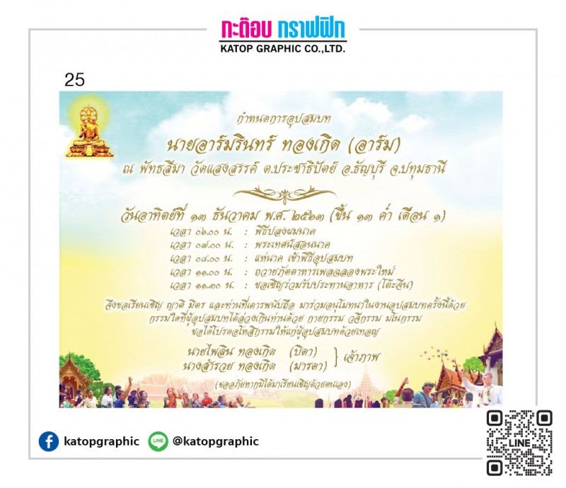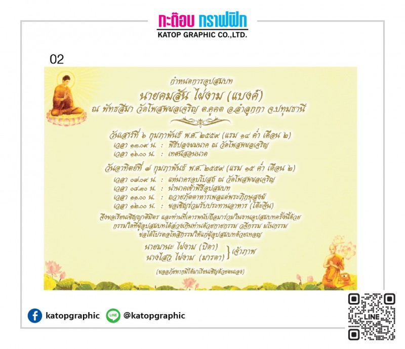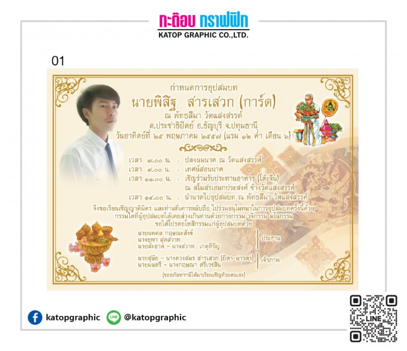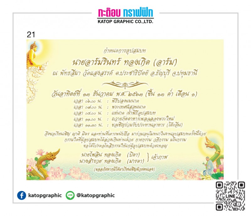 สำหรับลูกค้าที่กำลังมองหาร้านพิมพ์การ์ดงานบวชราคาประหยัด พร้อมบริการออกแบบโดยทีมงานผู้มีประสบการณ์ งานพิมพ์คมชัด ด้วยระบบการพิมพ์ Digital offset นึกถึง เรา กะต๊อบ กราฟฟิก งานเร็ว ตรงเวลา พร้อมบริการจัดส่งทั่วไทย สามารถสั่งพิมพ์ได้ทั้งปริมาณน้อยและมาก -