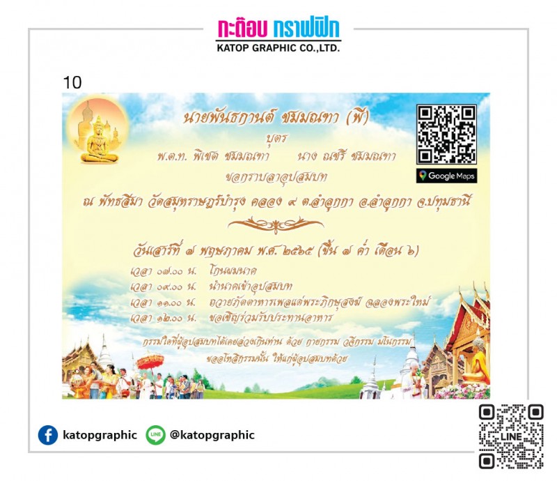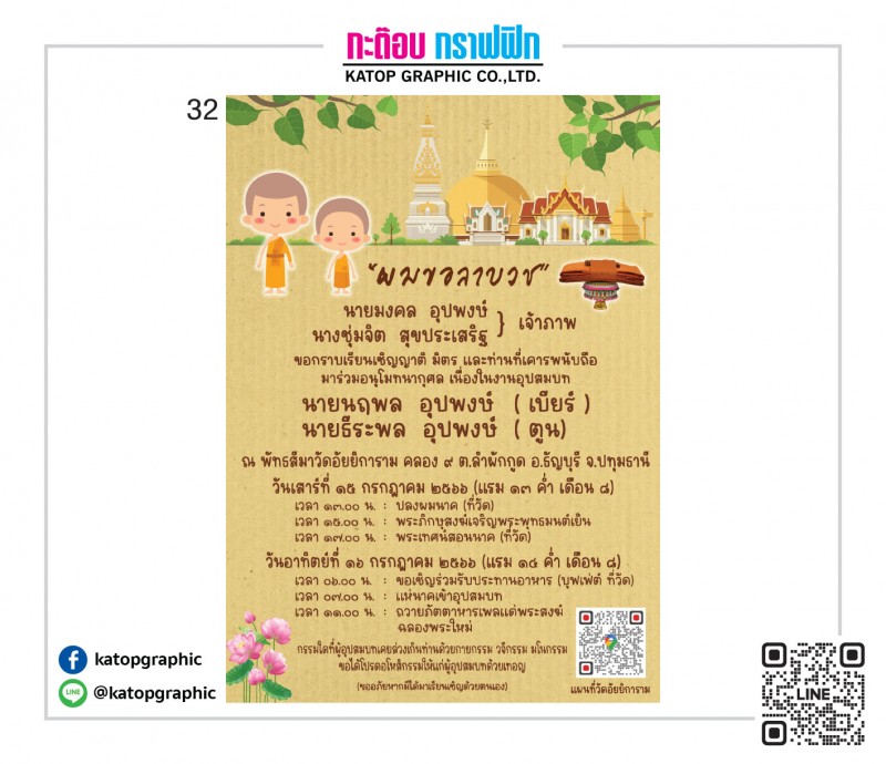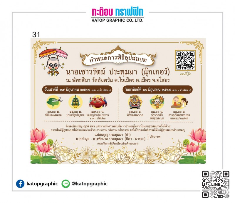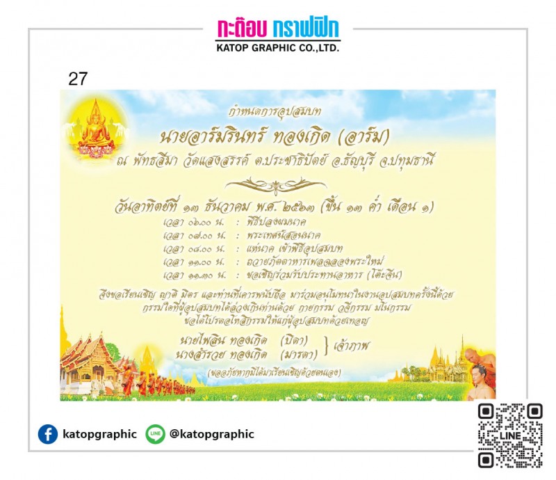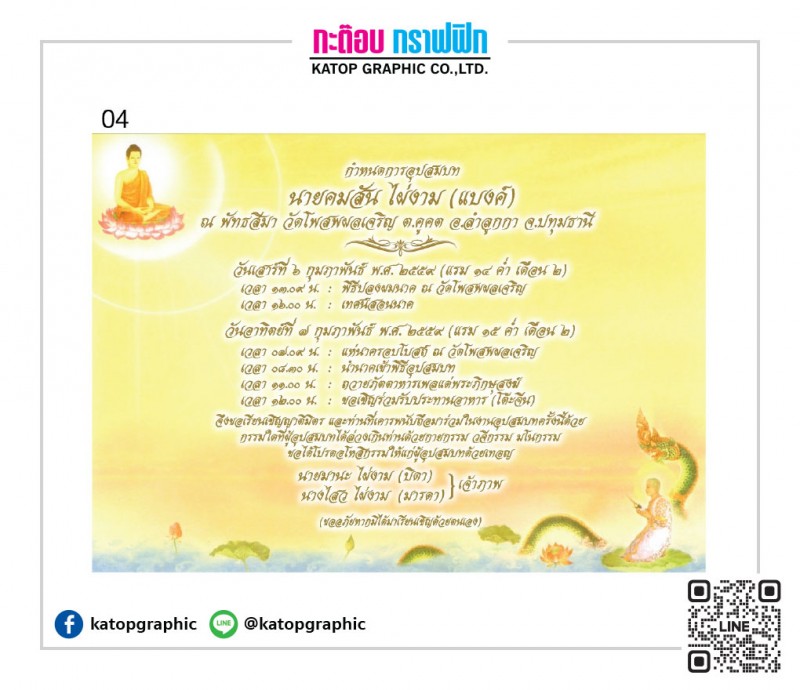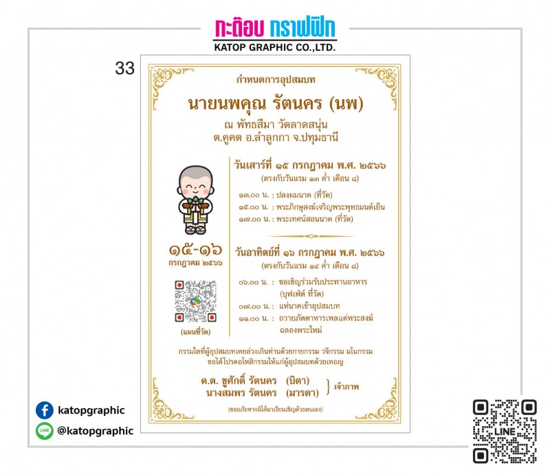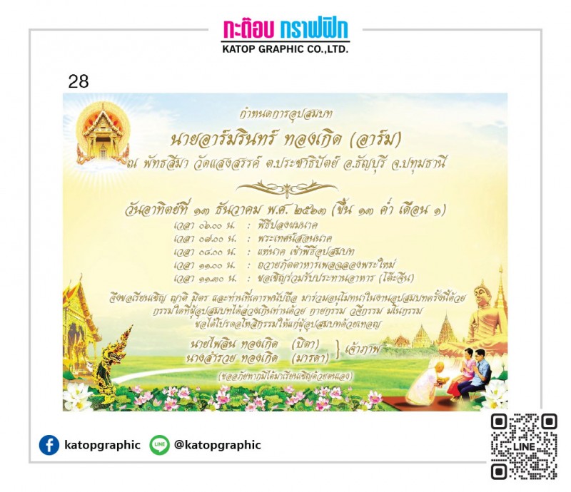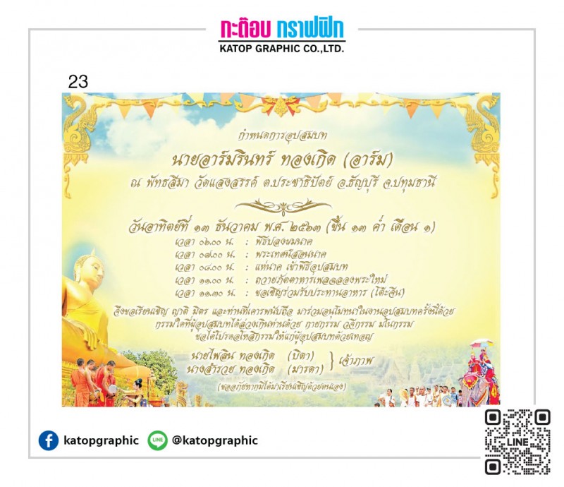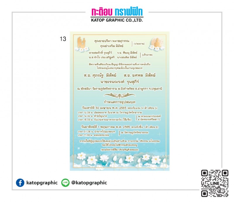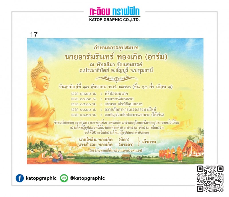 สำหรับลูกค้าที่กำลังมองหาร้านพิมพ์การ์ดงานบวชราคาประหยัด พร้อมบริการออกแบบโดยทีมงานผู้มีประสบการณ์ งานพิมพ์คมชัด ด้วยระบบการพิมพ์ Digital offset นึกถึง เรา กะต๊อบ กราฟฟิก งานเร็ว ตรงเวลา พร้อมบริการจัดส่งทั่วไทย สามารถสั่งพิมพ์ได้ทั้งปริมาณน้อยและมาก -