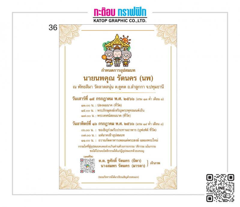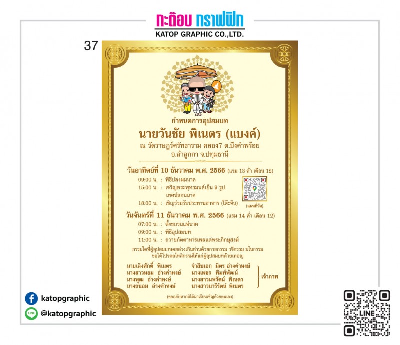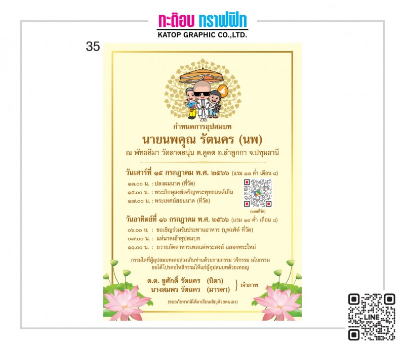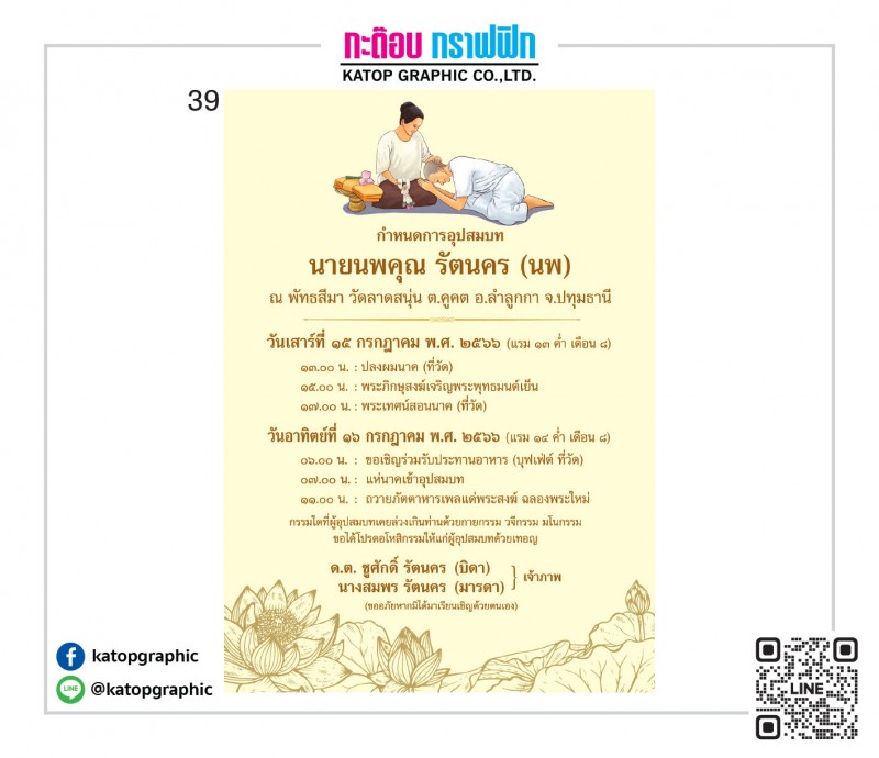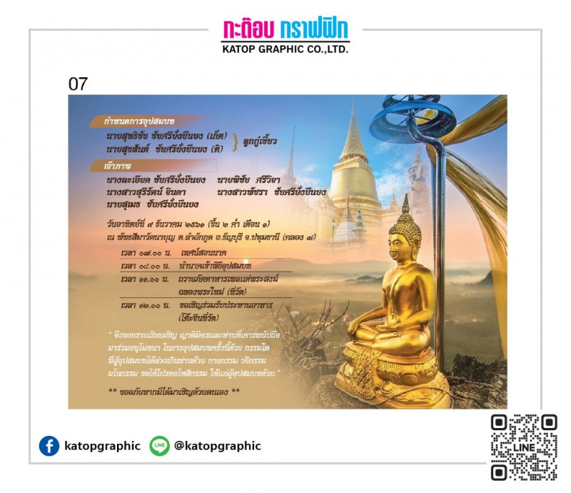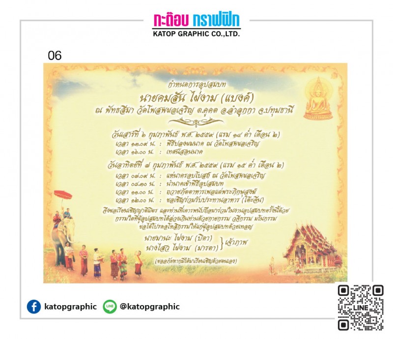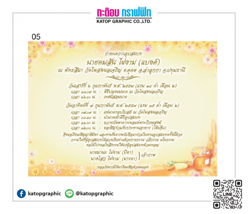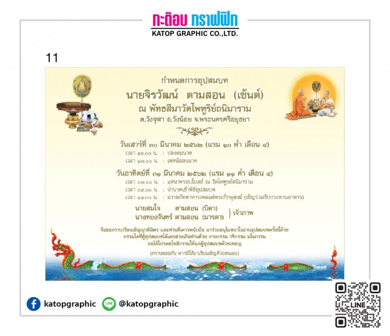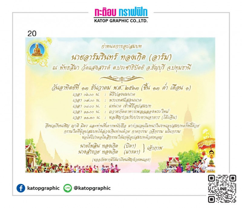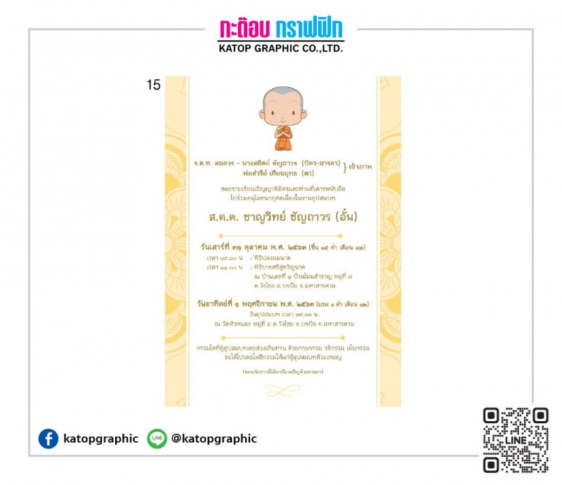 สำหรับลูกค้าที่กำลังมองหาร้านพิมพ์การ์ดงานบวชราคาประหยัด พร้อมบริการออกแบบโดยทีมงานผู้มีประสบการณ์ งานพิมพ์คมชัด ด้วยระบบการพิมพ์ Digital offset นึกถึง เรา กะต๊อบ กราฟฟิก งานเร็ว ตรงเวลา พร้อมบริการจัดส่งทั่วไทย สามารถสั่งพิมพ์ได้ทั้งปริมาณน้อยและมาก -
